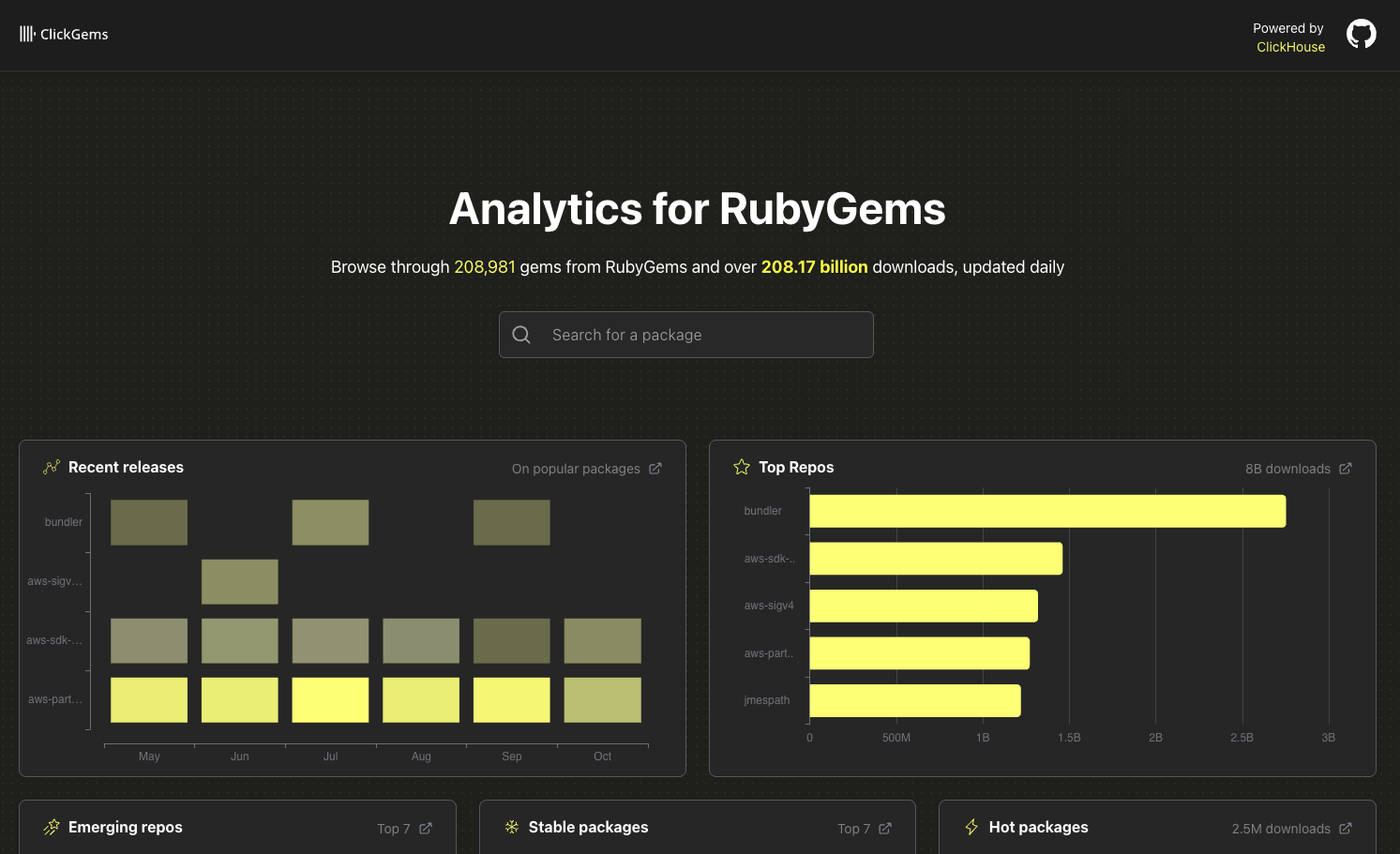 ClickHouse, Ruby Central, and Metabase collaborated to launch ClickGems, a free analytics platform providing comprehensive download statistics for over 200,000 Ruby gems totaling 208 billion downloads from 2017 to present. The platform leverages ClickHouse's analytics database with materialized views for fast query performance, offering shareable charts, download trends, geographic distribution, and emerging package detection across Recent Releases, Top Repositories, Hot Packages, and Stable Packages categories. The ruby_llm dashboard exemplifies the platform's AI-focused gem tracking, showing Carmine Paolino's RubyLLM gem has achieved 3.7 million downloads with significant growth starting June 2025, peaking at over 312,000 downloads in July and September. ClickGems enables developers to export visualizations to documentation and project pages while providing direct SQL query access through ClickHouse's SQL Playground for custom analytics.
