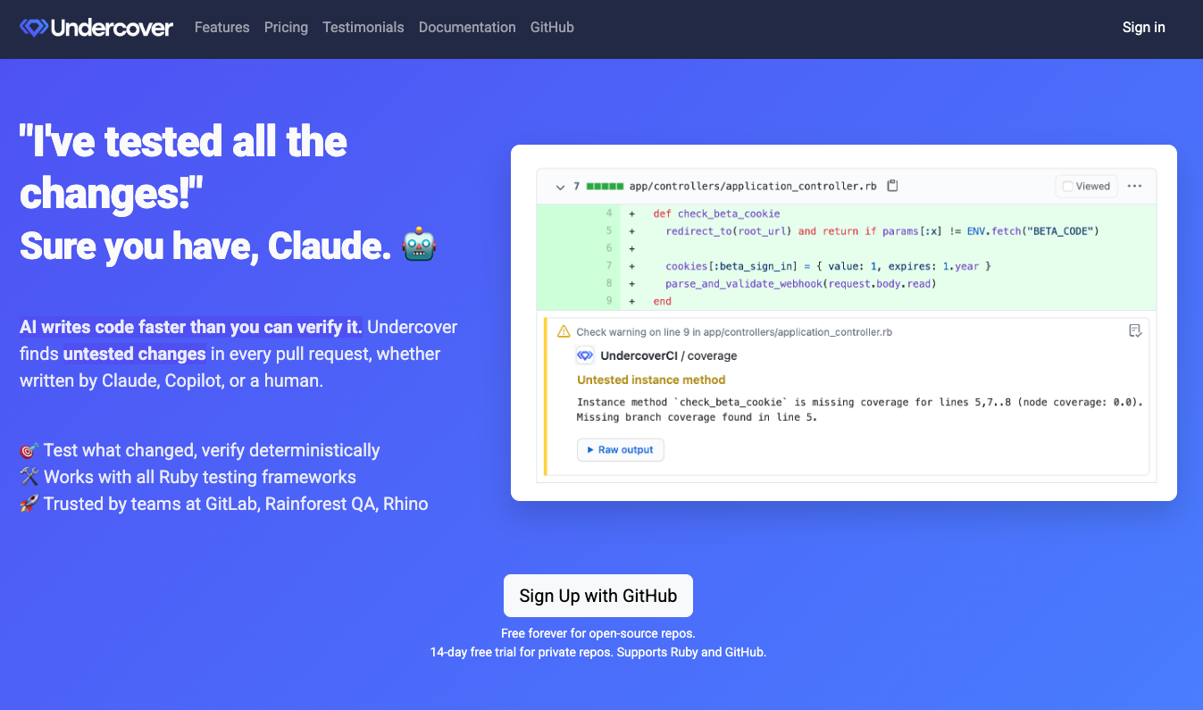 Jan Grodowski created Undercover CI, a GitHub-integrated service detecting untested changes in pull requests whether code is written by AI tools like Claude or by humans, providing smart annotations and dashboard tracking for PR trends. With a focus on auto-generated code, Undercover CI analyzes code structure and your SimpleCov rules, allowing you to merge commits with confidence and monitor the health of your test suite. Also available as a Ruby gem, Undercover identifies methods, classes, and code blocks modified without test coverage by analyzing git diffs, code structure, and SimpleCov reports. The tool integrates with all Ruby testing frameworks, supporting both line and branch coverage analysis with configurable .undercover files, and runs locally via CLI or in CI/CD pipelines. Discovered thanks to their sponsorship of the Short Ruby Newsletter!