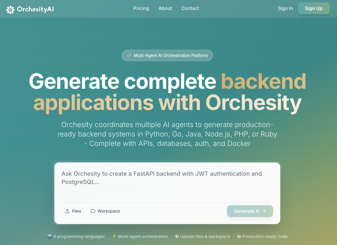 Orchesity created an AI orchestration service for specialized AI agents to generate production-ready backend applications, including Ruby as a supported framework. Built by Rickie Anh Nguyen, the platform moves from prompt to production by generating complete backends with authentication, database integration, tests, Docker, and CI/CD with intelligent task distribution. For Rails developers, Orchesity generates project scaffolding, database integration, secure authentication systems, specialized AI agents, and coordinates AI orchestration with intelligent routing.